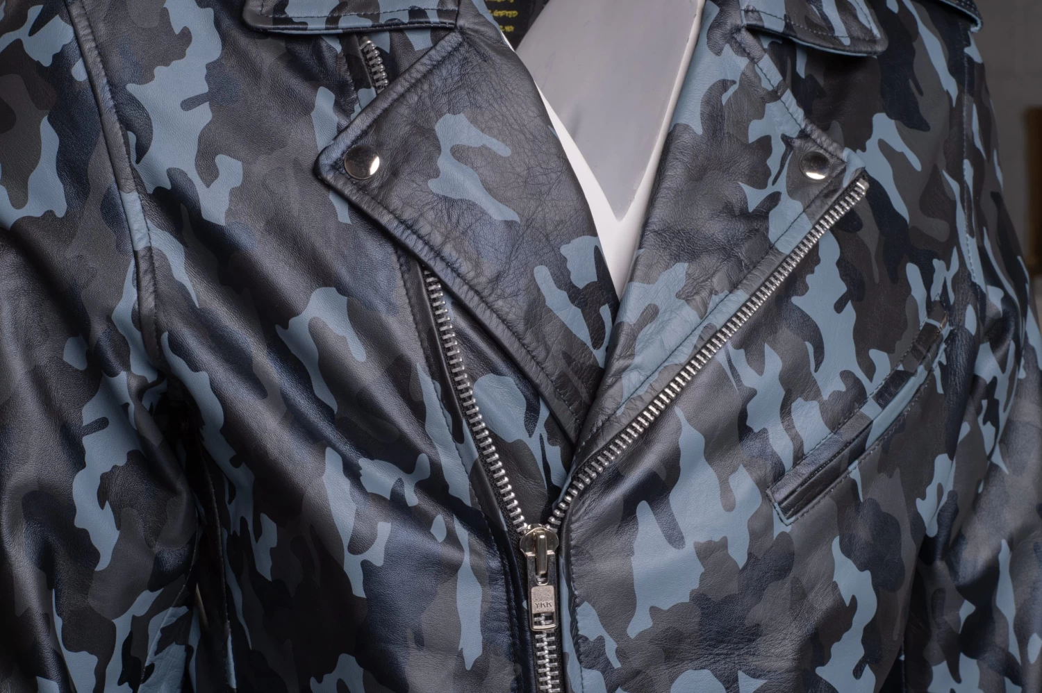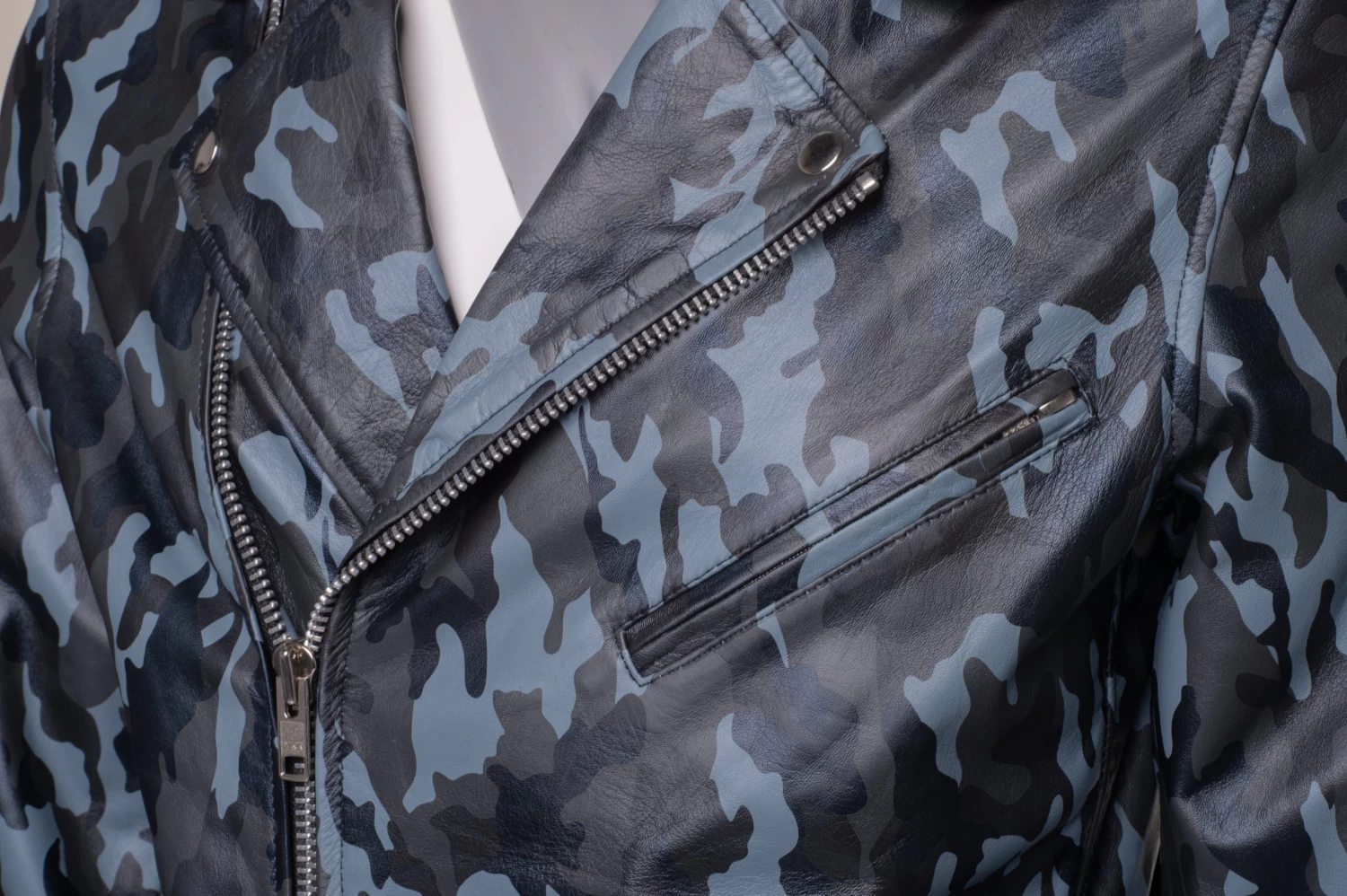 Adopt a style that can build a self-centered look and make you appear intensely charming. This Aman Dowling’s Blue Camouflage biker-style jacket can provide you with such a look. This phenomenal jacket has Side Zipper Closure, Notch lapels with press studs collar style, open Hem zipped cuffs, 1 pocket inside and 3 functional zipped pockets & one coin pocket