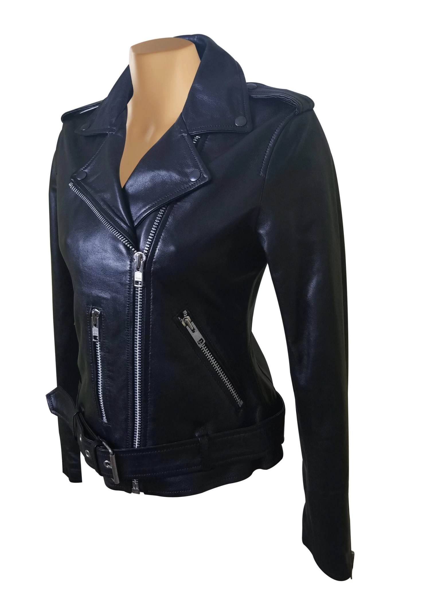 Wants to shield you against cold climate and to make you feel warm and cozy? Try this Arielle’s biker style black leather jacket with waist belt for a very appealing sight. The jacket is manufactured from full-grain leather material. The inner soft satin polyester lining makes this outwear very comfortable that you can carry it all day long. Arielle’s biker style black leather jacket has full-length sleeves with open hem zipper cuffs and side zipper closure. The notch lapel-style collar adds more style to the jacket.