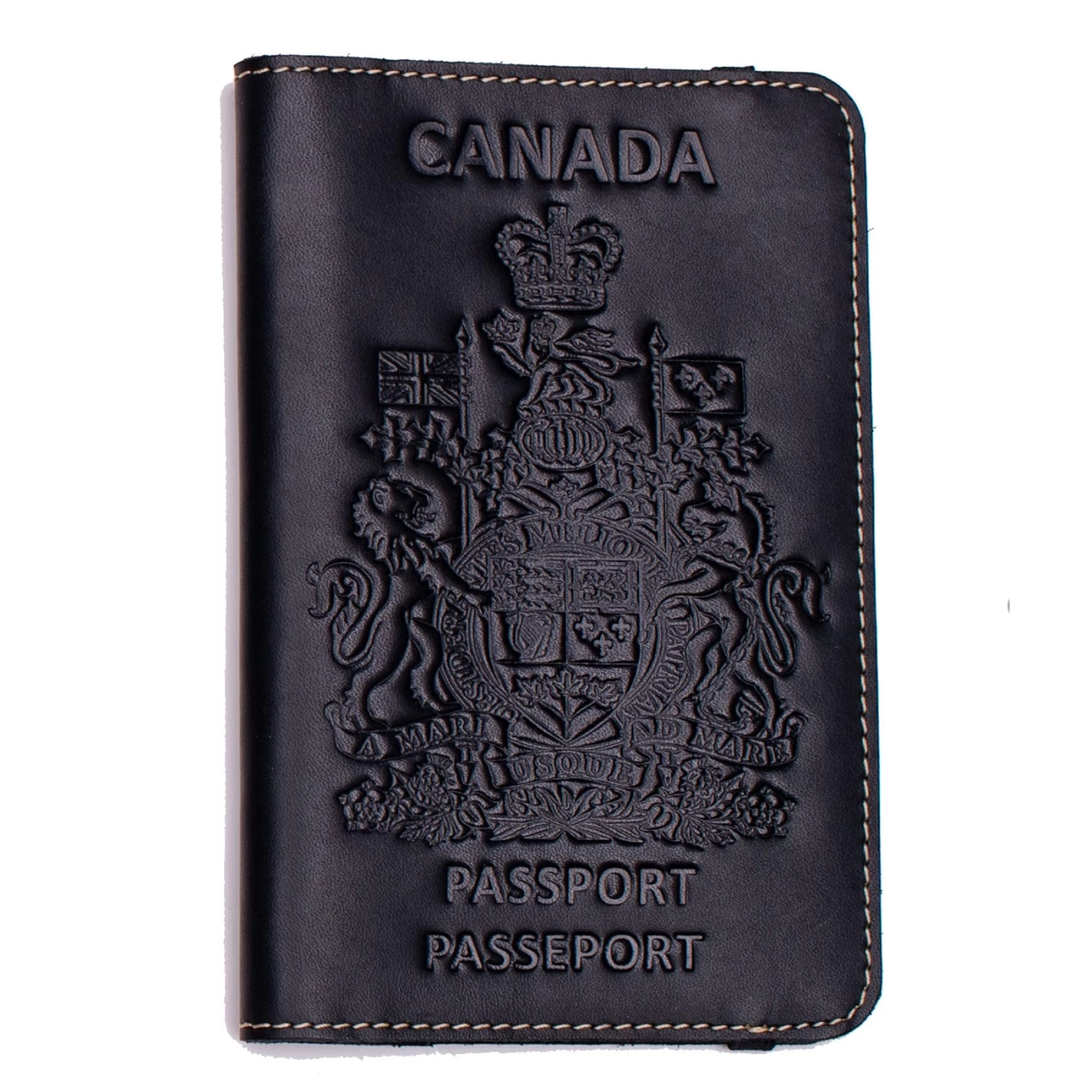 Sleek Minimalist Leather Passport Cover with Card Holder with the Canadian Emblem debossed into the leather.