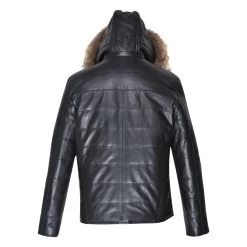 Traynor’s Puffer Winter Leather Jacket With Ribbed Cuffs And Waist And Fur Trim Hoodie