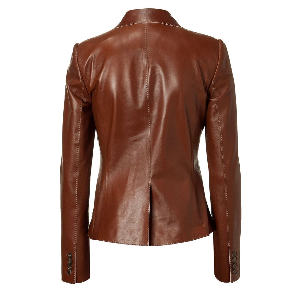 Are you seeking a versatile outwear that will let you experience a fabulous appearance at a reasonable price? Then Women’s Dark Cognac leather blazer is perfect for every occasion. A dark Cognac leather blazer will give you a mature and classy look. Full-grain Leather has been used in its making so you can get a durable and sweat-resistant jacket at an affordable cost. To increase the elegant appearance of the exemplary blazer, a Lapel-style Collar with one button closure. Its Stylish open-hem Cuffs will surely give you a phenomenal look. The Women’s Dark Cognac leather blazer introduces an elegant and charismatic appearance to you.